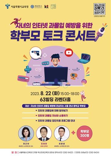 서울특별시교육청은 8월 22일 15:00부터 63빌딩 라벤더홀에서 중학생 학부모 300명이 참여하는 ‘자녀의 인터넷 과몰입 예방을 위한 학부모 토크 콘서트’를 진행한다.