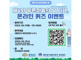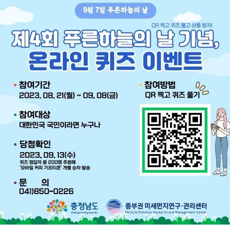 충남도는 ‘제4회 푸른 하늘의 날(9월 7일)’을 기념해 다음달 8일까지 대기환경과 기후변화에 대한 인식을 높이기 위한 온라인 퀴즈 이벤트를 진행한다고 22일 밝혔다.