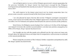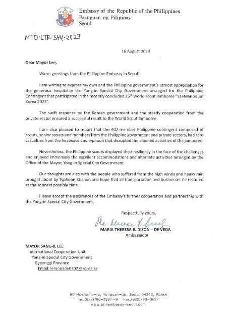 편지에는 폭염과 태풍으로 잼버리 대회가 조기에 중단돼 용인에 머물게 된 400여 명의 필리핀 스카우트 대원들이 용인특례시가 마련해 준 숙소에 머물며 훌륭한 프로그램들을 신나게 즐겼고, 단 한 명도 사고 없이 무사히 필리핀에 잘 도착했다는 소식이 담겨 있다.