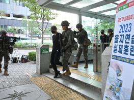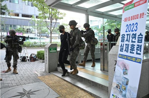 대구광역시 남구청에서는 지난 22일 오후 5시, 도시철도 1호선 교대역에서 테러범의 폭발물 폭파에 의한 화재발생, 테러범 및 화재진압, 주민대피 등 테러 및 화재 대응 훈련을 주제로 한 『2023년 을지연습 실제훈련』을 실시했다고 23일 밝혔다.