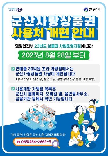 이번 조치는 상대적으로 영세한 소상공인 매장에서 군산사랑상품권이 사용될 수 있도록 하는 것으로, 연 매출액 30억원을 초과하는 가맹점에서는 상품권 사용을 제한하는 행정안전부 지침에 따라 시행한다.