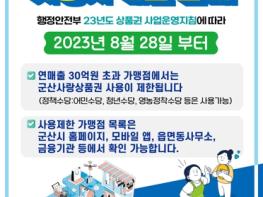군산시가 오는 28일부터 2023 행정안전부 지역사랑상품권 발행 지원사업 종합지침에 따라 군산사랑상품권 12,846가맹점 中 201개 가맹점에서 상품권 사용을 제한한다.