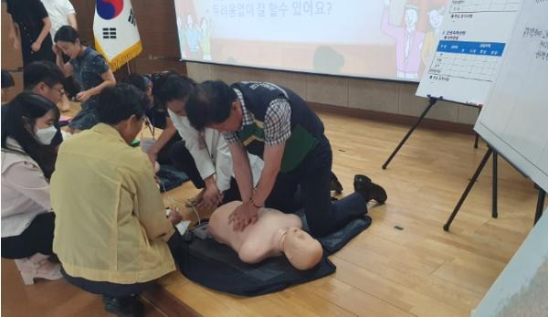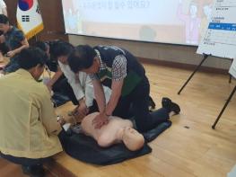 이날의 심폐소생술 교육은 △2018년 5월 태안초등학교 학생이 의식을 잃고 마당에 쓰러진 자신의 할아버지를 학교에서 배운 심폐소생술로 구한 미담을 시작으로 △심폐소생술에 대한 이론 교육 △자동제세동기 사용법 교육 △심폐소생술 실습 순으로 진행됐다.