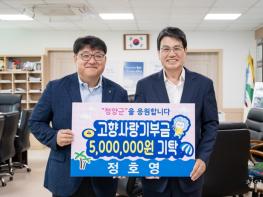 지난 6월 14일 청양군을 방문해 500만 원을 전달한 정 대표는 고향 청소년들이 끼와 열정을 발휘하는 데 보탬이 되도록 답례품으로 받은 청양사랑상품권(150만 원)을 청양군청소년재단(이사장 이종필)에 맡겼다.