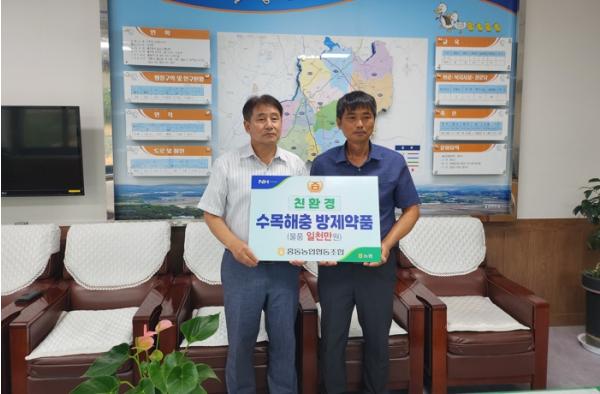 주정산 조합장은 “최근 미국흰불나방이 급증하여 수목 피해가 심각함에 따라 홍동면에 친환경 방제 약품을 기탁하며 산림병해충 확산 방지에 보탬이 되길 바란다.”고 말했다.