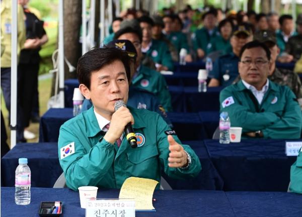 을지연습과 연계하여 23일 오후 2시 6년 만에 전국적으로 실시되는 '공습대비 민방위 훈련'에 대비하여 홈페이지, SNS, BIS(버스정보시스템), 지역방송 등 집중 홍보하여 훈련분위기를 조성하고, 중앙지하도상가를 시범대피소로 선정하여 적 공습 시 주민안전 보장을 위해 주민대피훈련, 국민행동요령 교육, 방독면 착용 체험 등을 실시했으며 진주소방서, 제39사단 등이 합동으로 참여하는 ‘긴급차량 실제 운행훈련’을 함께 진행했다.