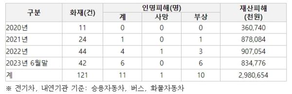 연도별 전기차 화재 현황을 살펴보면 2020년 11건(인명피해 0건), 2021년 24건(인명피해 1명), 2022년 44건(인명피해 4명)이었으며, 올해 상반기만 42건(인명피해 6명)에 이르는 것으로 나타났다.