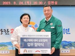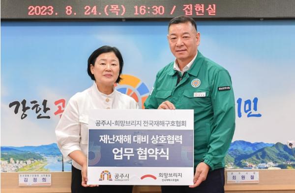 공주시가 지난 24일 시청 집현실에서 희망브리지 전국재해구호협회와 재난?재해 대비 상호 협력을 위한 업무 협약을 체결했다.