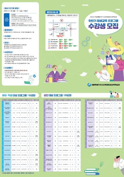 세종특별자치시교육청평생교육학습관은 8월 28일부터 9월 1일까지 2023년도 하반기 평생교육 프로그램 수강생을 모집한다.