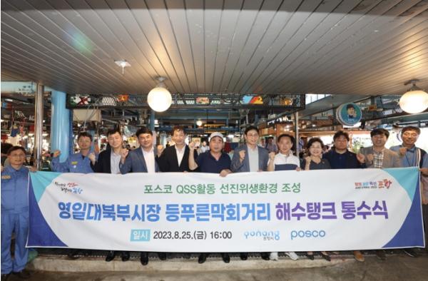 이번 해수 탱크 설치는 영일대 북부시장 등푸른막회거리 활성화를 위한 포스코 QSS 혁신 활동 사업의 하나로, 지난 5월부터 기본설계, 탱크 설치, 배관작업, 전기 분전함 설치 등 포스코의 지원으로 이뤄졌다.