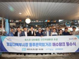 포항시는 25일 영일대 북부시장에서 포스코 QSS 혁신 활동과 연계해 영일대 북부시장 등푸른막회특화거리 위생환경 개선사업의 하나로 해수 탱크 및 급수 배관을 설치하고 ‘해수 탱크 통수식’을 개최했다.