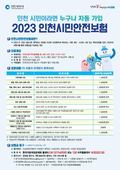 인천 시민 안전보험은 인천에 주민등록을 두고 거주하는 모든 시민(등록 외국인 포함)이 별도의 가입절차 없이 자동으로 가입되며 폭발·화재·붕괴 상해 사망 및 후유장해, 대중교통 이용 중 상해 사망 및 후유장해, 사회재난 사망 등의 담보에 대해 보험사와의 약정 내용에 따라 최대 1,500만 원까지 보장받을 수 있다.