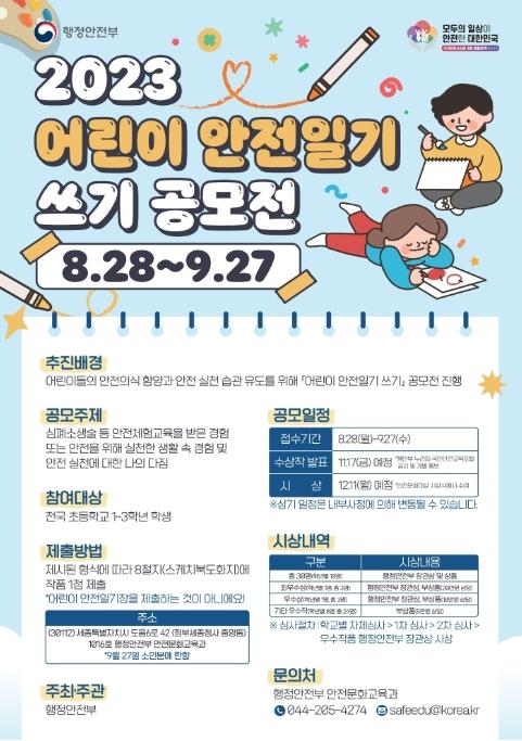 행정안전부는 ‘대한민국, 안전하자’ 캠페인*의 일환으로 어린이들의 안전 실천을 생활화하고, 안전에 대한 국민적 관심을 높이기 위해 8월 28일부터 9월 27일까지 ?어린이 안전일기 쓰기 공모전?을 개최한다고 밝혔다.