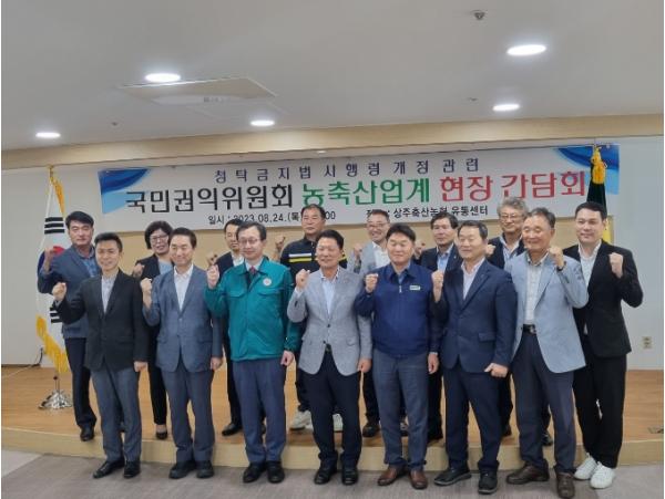 상주시에서는 지난 24일(목) 국민귄익위 청탁금지법 시행령 개정안 의결과 관련하여 상주축산농협 유통센터에서 국민권익위원회 농축산업계 현장 감담회를 개최했다.