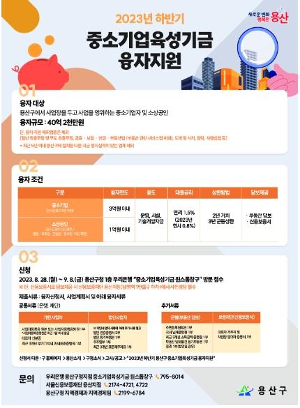 박희영 용산구청장은 “중소기업육성기금 융자는 일반은행보다 낮은 대출금리로 지원하지만 올해 한시적으로 0.8%의 저리로 지원할 것”이라며 “경기 침체와 금리 상승으로 경영난을 겪고 있는 중소기업과 소상공인들에게 체감할 수 있는 도움이 되길 바란다”고 말했다.