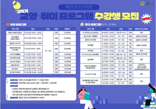 예천군은 청소년의 건강한 성장과 건전한 문화생활 지원을 위해 8월 28일부터 9월 3일까지 2학기 청소년 프로그램 수강생을 모집한다.
