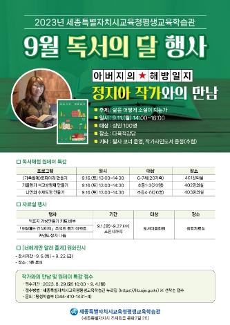 독서의 달 행사는 세종시민이면 누구나 참여할 수 있으며, 8월 29일부터 9월 4일까지 평생교육학습관 누리집을 통해 신청 가능하다.