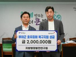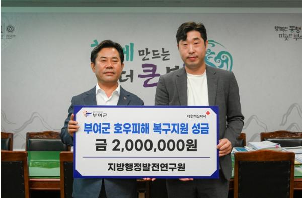 충남지방행정발전연구원(주)은 지난 25일 부여군청을 찾아 집중호우 수해복구 성금 2백만원을 기탁했다.