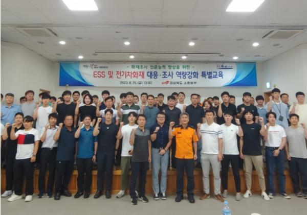경북소방본부는 25일 의성소방서에서 도내 21개 소방서 화재조사관과 현장 대응요원 등 70명이 참석한 가운데 관련분야 전문가인 국립소방연구원 나용운 박사를 초빙해 ESS 및 전기자동차 화재 대응과 화재조사기법 특별교육을 실시했다.