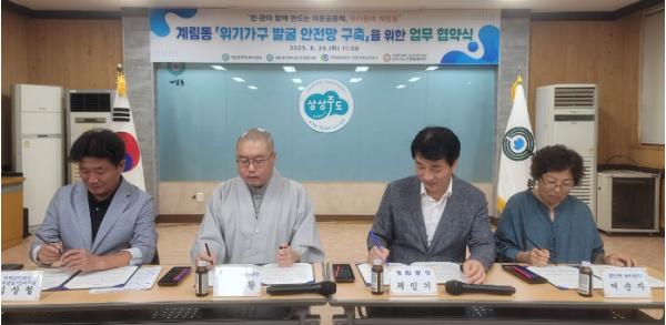 상주시 계림동행정복지센터는 8월 29일(화) 계림동지역사회보장협의체와 상주시노인종합복지관, 주택관리공단 LH냉림3관리소와 계림동만의 민관 위기가구 발굴 안전망 구축을 위한 다자간 업무협약(MOU)을 체결했다.