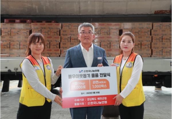 (사)한국나눔연맹은 전국에 천사무료급식소를 운영하며 국내외 이웃 사랑을 실천하는 순수 선행기관으로, 앞서 예천읍 수해복구 봉사활동에도 참여하고 옷 100벌과 두유 100박스를 전달하기도 했다.