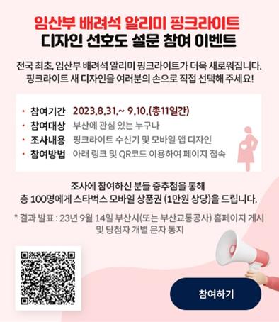 부산시는 오늘(31일)부터 오는 9월 9일까지 임산부 배려석 알리미 '핑크라이트'의 디자인 선호도 조사를 실시한다고 밝혔다.