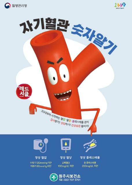 원주시보건소는 심뇌혈관질환 예방관리 주간(9월 1일~7일)을 맞이하여 9월 한 달간 ‘자기혈관 숫자 알기, 레드서클 캠페인’을 실시한다.