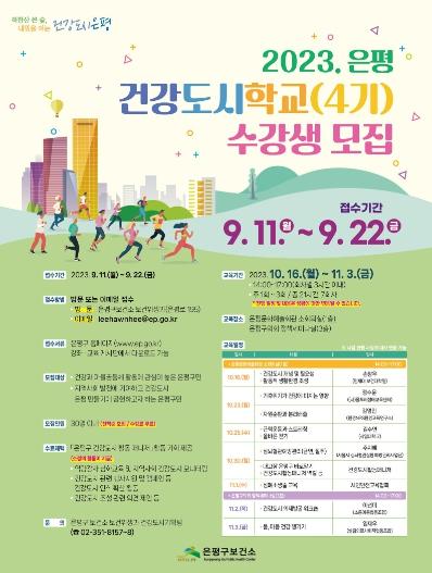 신청은 은평구청 홈페이지 강좌/교육 게시판에서 건강도시학교 신청서를 내려받아 작성한 후 해당 담당자 이메일 또는 은평구보건소 7층 보건위생과로 방문해 제출하면 된다.