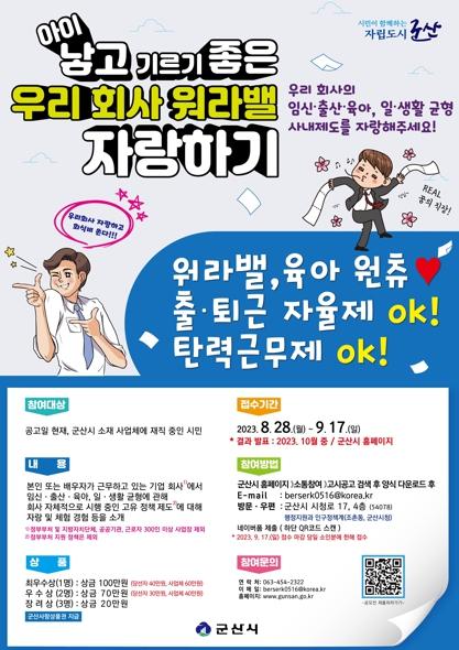 군산시는 직장 내에서 자체적으로 운영 중인 가족친화제도 자랑 및 에피소드 공유를 통해 워라밸 문화를 군산 전반으로 확산하기 위한 아이 낳고 기르기 좋은'우리 회사 워라밸 자랑하기'공모전을 개최한다고 밝혔다.