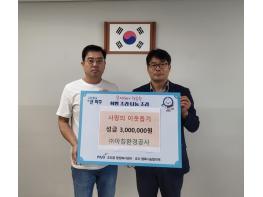 ㈜아침환경공사는 2016년도부터 어려운 이웃을 위해 성금을 기탁해 오고 있으며, 이날 조리읍 행정복지센터에 방문해 올해 2월 이웃돕기 성금 300만 원 후원에 이어 다시 한번 따뜻한 손길을 전했다.