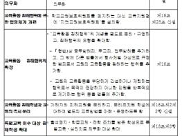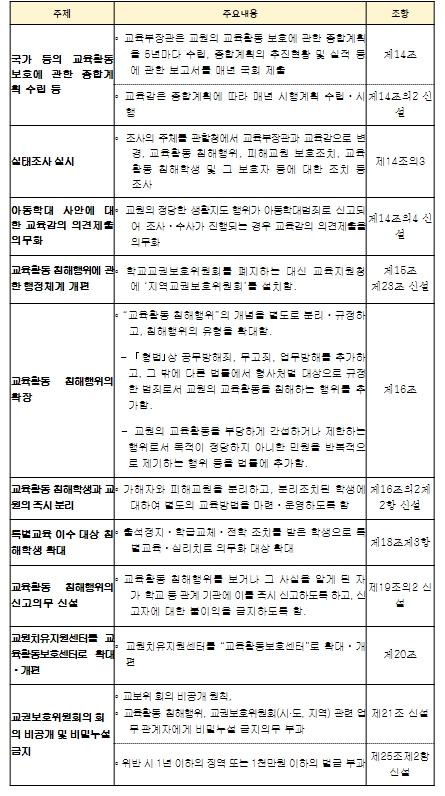 관련 법안은 교권 보호 4대 법안으로 「교원의 지위 향상 및 교육활동 보호를 위한 특별법」, 「초중등교육법」, 「유아교육법」 및 「교육기본법」이며, 법안별 주요 개정 사항은 붙임과 같다.
