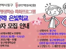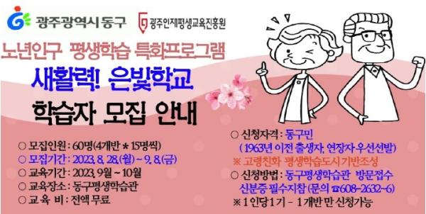 광주 동구는 고령인구 특화형 평생학습 프로그램인 ‘새 활력 은빛 학교’ 학습자를 오는 9월 8일까지 모집한다고 밝혔다.