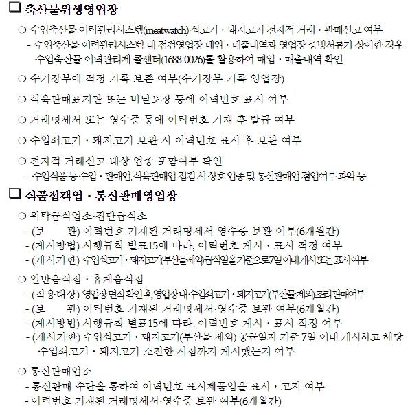 이번 특별단속에서는 수입 쇠고기·돼지고기 취급 업소의 거래신고 및 매입·매출내역 등의 기록·관리, 이력번호 표시 여부 등을 중점적으로 확인한다. 위반사항을 적발할 경우에는'가축 및 축산물 이력관리에 관한 법률'에 따라 최대 500만원의 벌금 또는 과태료를 부과할 예정이다.