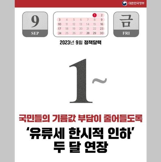 - 유류세 인하 기간 연장 : 2023.9.1. ~ 10.31.