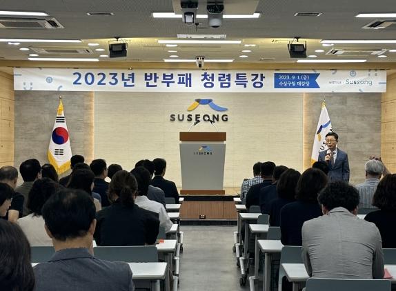 대구 수성구는 지난 1일 공직사회의 관행적 부패 척결과 청렴한 공직문화 확산을 위해 구청 대강당에서 전 직원을 대상으로 반부패 청렴 특강을 실시했다.