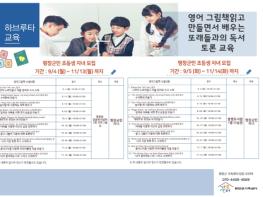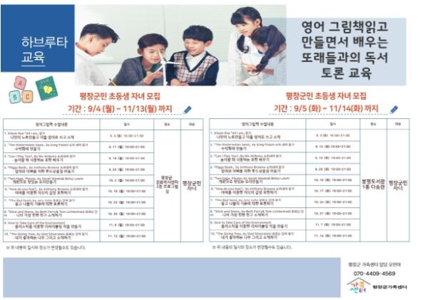 “하브루타 교육”은 유대인의 전통적인 학습교육 방법이며‘영어그림책놀이’교육내용으로, 4~6학년의 초등학생을 대상으로 평창지역은 9월 4일 월요일마다 10회, 봉평지역은 9월 5일 화요일마다 10회기 나누어 진행될 예정이다.