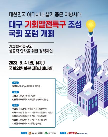 대구광역시는 9월 4일 오후 2시 국회의원회관 제3세미나실에서 양금희 국회의원과 공동으로 ‘대구 기회발전특구 국회 포럼’을 개최한다.
