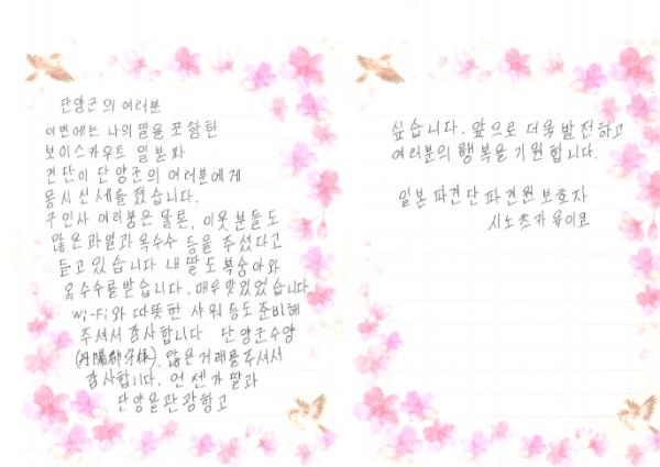 시노츠카 유이코는 편지에 “이번에 우리 딸을 포함한 일본 스카우트 대원들이 단양에 몹시 신세를 졌다”며 “구인사 여러분은 물론 이웃분들도 많은 과일과 옥수수, 복숭아 등을 주셨다고 들었다. WIFI와 따뜻한 샤워를 할 수 있도록 준비해 주셔서 감사하다”고 말했다.