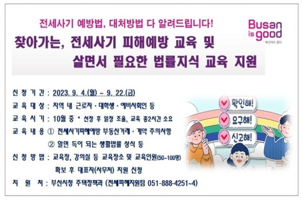 부산시는 오는 10월 청년·사회초년생을 대상으로 '찾아가는 전세사기 피해예방 교육'을 실시한다고 밝혔다.