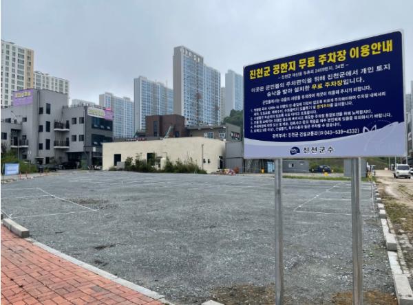 진천군은 충북혁신도시 두레봉 공원 인근 공한지(사유지)의 사용 승낙을 받아 임시 무료 주차장으로 개방한다고 4일 밝혔다.
