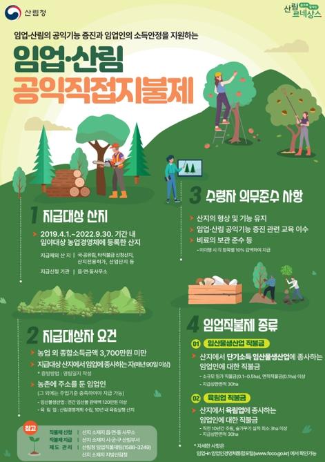 김종운 산림휴양과장은 ”공익가치가 큰 임업 분야의 임가 소득 보전과 산림의 공익가치 향상을 위해 관내 자격요건을 갖춘 임업인들이 수혜 대상에서 누락되는 일이 없도록 지속적으로 홍보해나가겠다“라고 말했다.