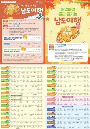 조대정 전남도 관광과장은 “올 가을 대규모 행사를 위해 전남을 찾는 관광객에게 이번 남도한바퀴 특별상품은 전남 구석구석을 즐기는 좋은 기회가 될 것”이라며 “편안하고 행복한 여행이 되도록 상품 운영에 최선을 다하겠다”고 말했다.