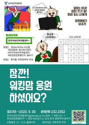전주여성인력개발센터는 제28회 양성평등주간(9월 1일~9월 7일)을 맞아 9월 한 달 동안 ‘워킹맘 응원챌린지’를 진행한다고 4일 밝혔다.