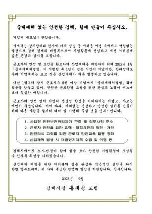 이번 서한문은 근로자 50명 이상의 사업장만 적용됐던 중대재해처벌법이 내년 1월 27일부터 근로자 5인 이상 사업장까지 확대 적용됨에 따라 기업체의 법 인식을 높이기 위한 것이다.