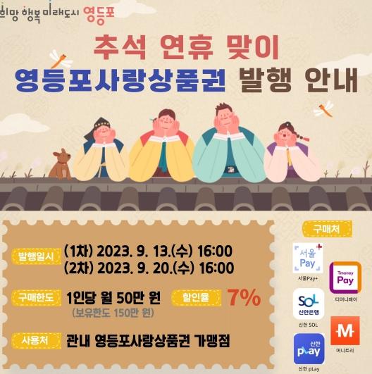 영등포구가 추석을 맞아 9월 13일과 20일, 2차에 걸쳐 160억 원 규모로 ‘영등포사랑상품권’을 발행해 지역 경제에 활기를 불어 넣는다고 밝혔다.