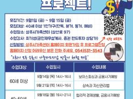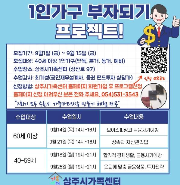 상주시 가족센터(센터장 김은정)는 1인 가구를 위한 '1인가구 부자되기 프로젝트' 참여자를 모집한다. '1인가구 부자되기 프로젝트'에서는 40세이상 1인 가구를 대상으로 보이스피싱과 금융사기 예방 등 재무관리 교육을 진행한다.