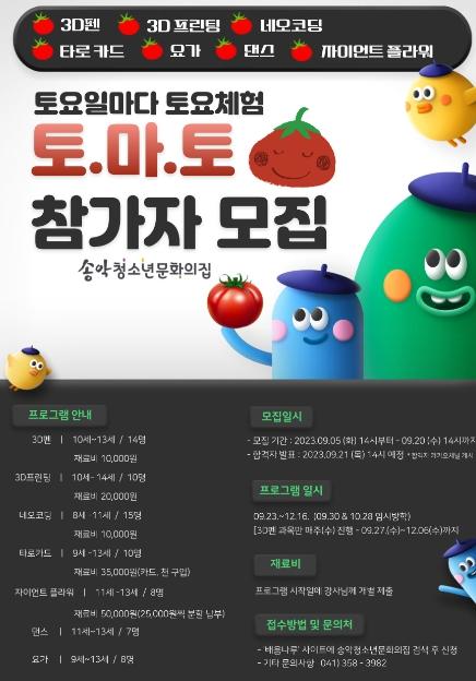 송악청소년문화의집에서 9월 23일부터 12월 16일까지 매주 토요일[3D펜-09.27~12.06(매주 수요일)] 총 11회기로 하반기 토.마.토(토요일마다 토요체험)가 진행된다. 2023년 하반기 토.마.토는 기존과 다르게 과목이 변경되어 진행된다.