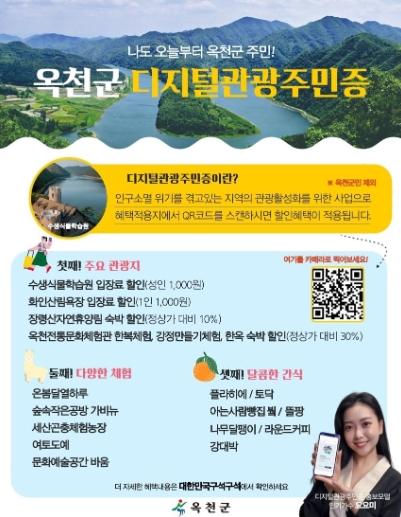 작년 10월, 옥천군과 한국관광공사가 시범 운영한 옥천군 디지털 관광주민증은 8월 22일 기준 38,515명이 가입했으며, 지용제 행사기간 내 4만명을 돌파할 것으로 예상된다.