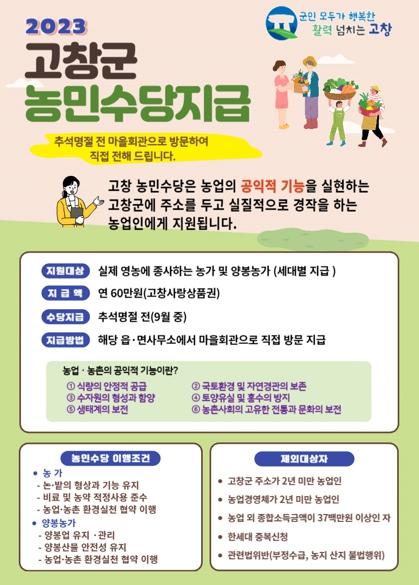 2019년 전북 최초로 농민 공익수당을 지급해온 고창군은 농업·농촌 공익적 가치의 전국적 확산에 일조하여 2020년 도내 14개 전체 시·군으로 확대 시행됐고, 2021년에는 어가와 양봉농가까지 포함됐다.