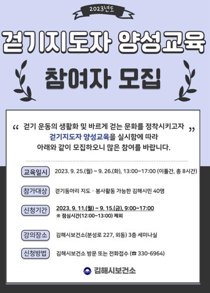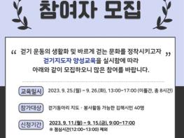김해시는 걷기시민모임의 저변확대로 걷기실천율 향상 및 시민건강증진에 기여하고자 2023년 걷기운동지도자 양성과정(제9기)을 실시한다고 밝혔다.